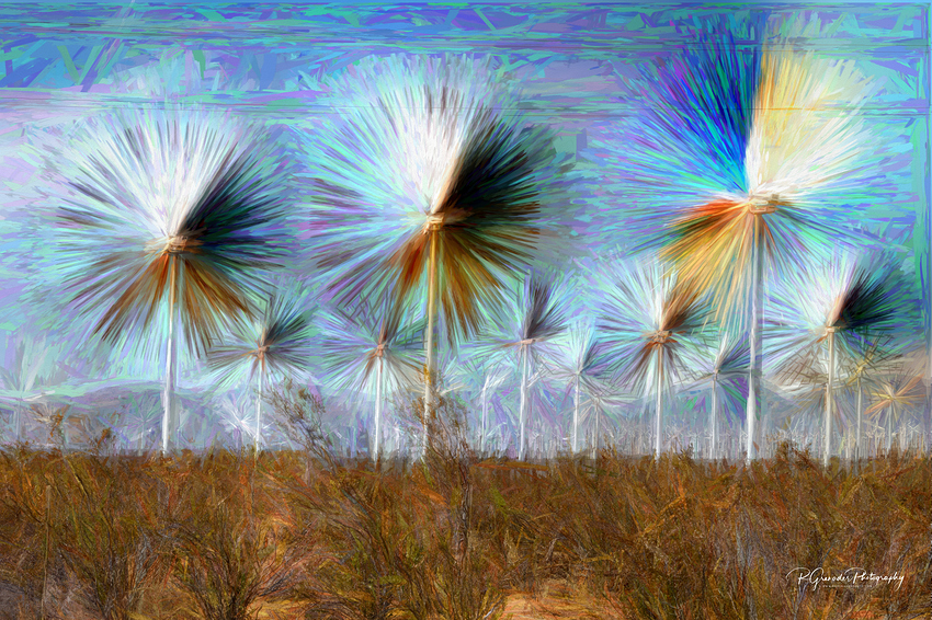 50 shots, 2 seconds apart stacked in Adobe Photoshop into 1 final image. Topaz Impressions with that excellent Leroy neiman filter. The color variations in the underlying images was due to flaky wind and the turbine blades rotating on their axis for optimal angle to available wind.