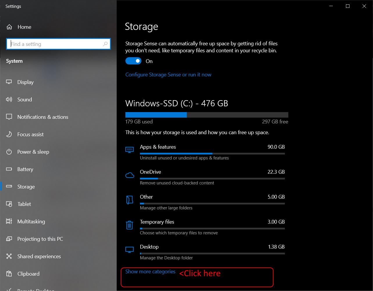 Method 2: (This would have been easier for me to do had I realized the settings were available… A shortcut to the first four steps below is to search for ‘storage settings’ and go directly to it).