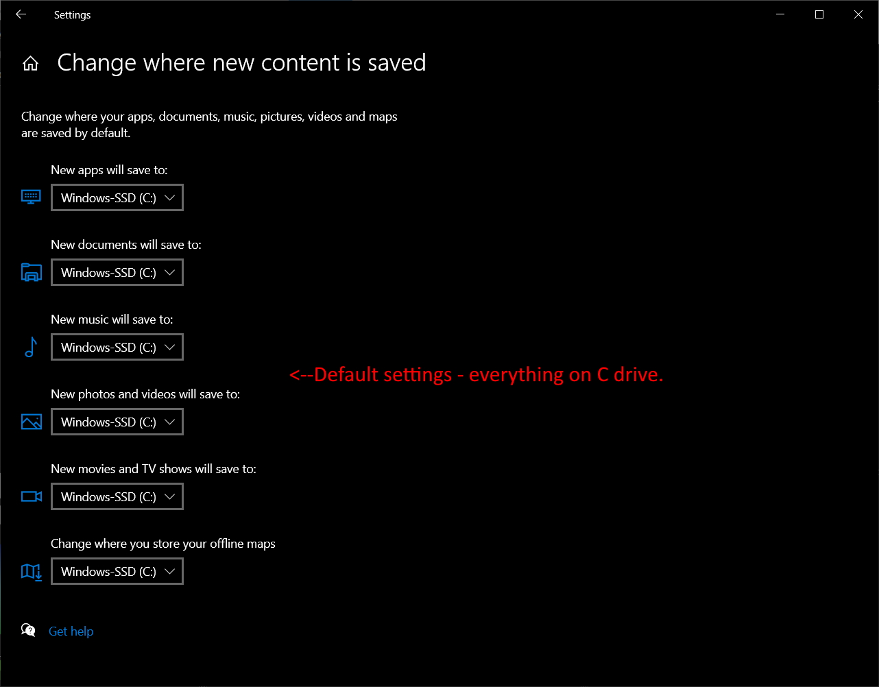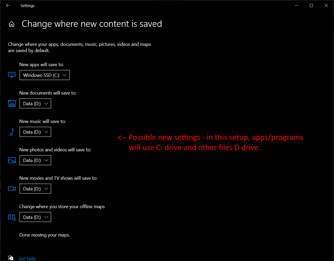 In general, it has been my experience that a fair balance of performance is to leave windows and installation of programs to be loaded to C: if that’s an SSD, and to offload data to the D: drive if possible and IF you have more space there. If space is not an issue - or if you have multiple SSD or just hard drives then this may not be helpful except as a reference to know where these settings are stored.