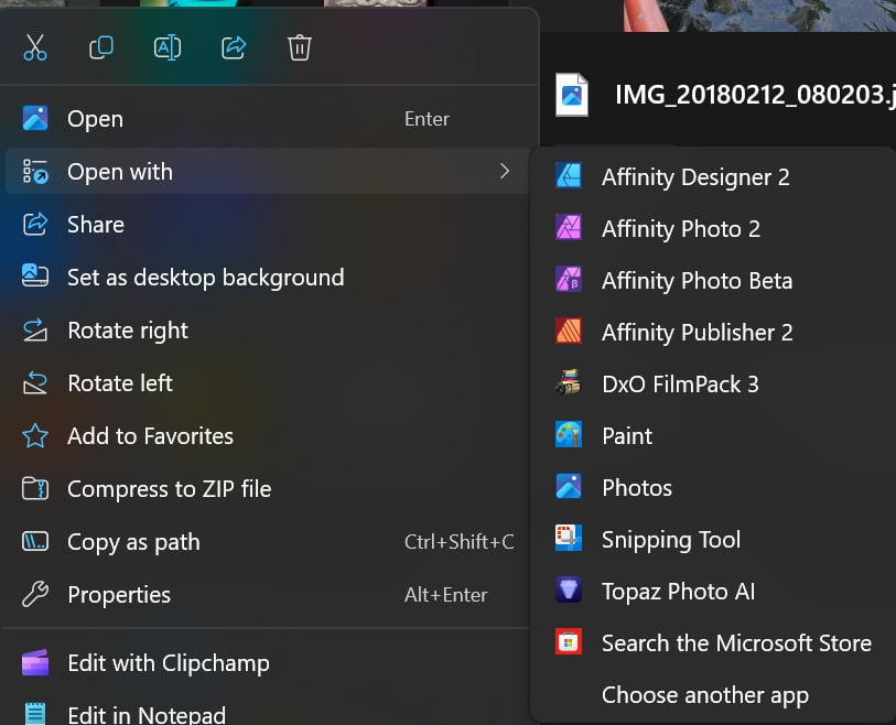 I do not know how to take a screen shot of something which closes as soon as I open my snipping tool, but trust me when I tell you it’s just a jpg file that will open with Topaz Photo AI without issue if I open Topaz first, or drill down to “choose another program” from the context menu and select Topaz. I would blame Microsoft and my unreleased beta build, but no other program behaves this way in the context menu. I edit thousands of photos a year and this happens with any and all jpg image files I try to open via right click in the initially showing apps in the context menu but does not happen if I reselect topaz from the “choose another program” dialogue in the right click menu.